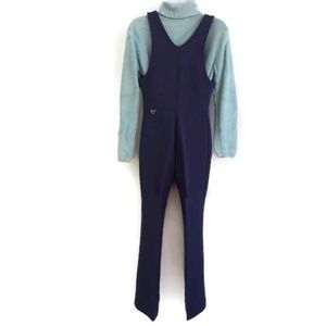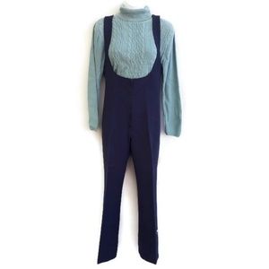 70s Obermeyer Ski Pant Bibs Navy Blue Stretch Snow. Skiing Snowboard Winter. Zip front. Heavy front crease. Heart logo on front leg. Heart logo hardware on back waist. Black gaiters and stirrup. Flattering and hugs your curves and holds it all in place. Wool Nylon & Spandex. Made in Japan. Tagged Vintage Sizing Ladies 10R. Measures Modern US Size S Small.