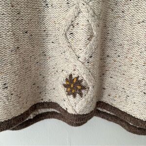 Cozy cable knit sweater by Obermeyer features unique silver buttons, embroidery on cuffs and back, and contrast color detailing all in a super soft and warm wool/cotton blend. Has shoulder pads that you can keep in or snip out.