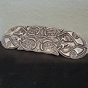 Elevate your hair accessory game with this stunning Celtic Peacock Silver Hair Barrett by Oberon Design. Crafted from high-quality silver, this hair barrette features an intricate peacock design that adds a touch of elegance to any hairstyle. The medium size is perfect for securing medium to thick hair, making it a versatile and practical accessory for everyday wear or special occasions. This used hair barrette is in excellent condition, showing minimal signs of wear, and is ready to add a touch of Celtic charm to your look.