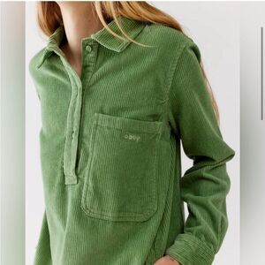 Sage green thick corduroy with button front, collar, pockets and breast pocket