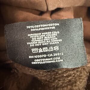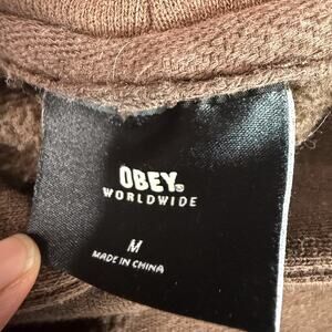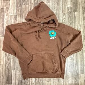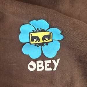 This is an Obey brown hoodie with vibrant flower graphic and logo artwork on front and back. Branded Obey Worldwide, 70% cotton / 30% polyester blend, soft fleece interior. Pullover style with hood and kangaroo front pocket. Clean seams, good print clarity, minimal signs of wear. Great for streetwear, skate, urban, casual layering.