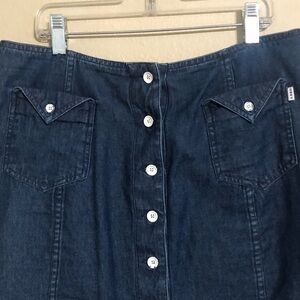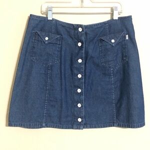 Obey Cotton Aline Mini Skirt in blue with front pockets trimmed with white buttons down center front