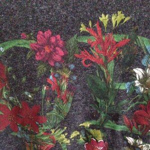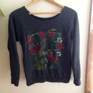 Cute floral, wide-neck sweatshirt from Obey. Dark gray background with a floral print on the front. It's not exactly cropped, but it is shorter than a traditional crewneck, and the neck is wider. Good used condition -- no holes, tears, stains, or odors.