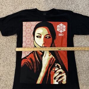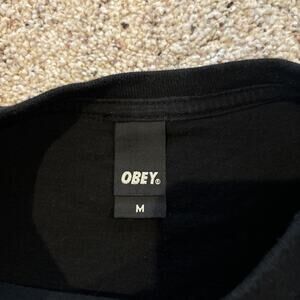 The Obey Men's T-Shirt in size medium features a solid black color with a graphic print of a peace woman, making it a statement piece for streetwear and skate culture. Made of comfortable cotton knit fabric, this regular fit t-shirt is machine washable and easy to care for. With a crew neck and short sleeves, it is perfect for all seasons and is accented with the OBEY logo, reflecting themes of hipster, art, rock, punk, and modern style. Ideal for those looking for a unique and trendy addition to their wardrobe.