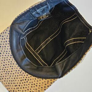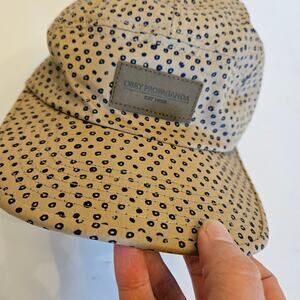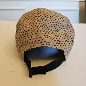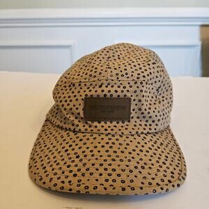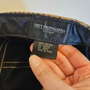 Obey 5 panel all-over print strap back cap. This hat is in a neutral tan color with blue dots allover, and logo tag on the front. The back has an adjustable size strap. Made of 100% cotton.