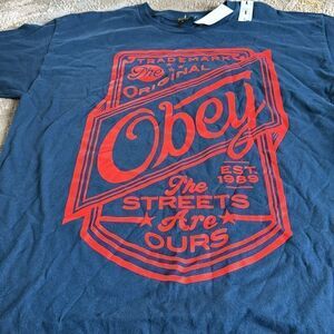 Obey Shirt size L Blue Street Graphic Modern Retro Stretch Logo Skate Crew NWT