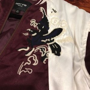 Maroon and white. Worn a few times and received numerous complements. Shiny Satin & relaxed fit. This jacket is timeless. Embroidered details on the front and back.
