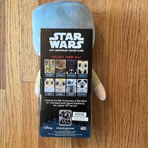 This Star Wars stuffed character features a charming design with a large, square-shaped head and expressive embroidered eyes. The plush toy is dressed in a light-colored robe with a darker gray or brown outer garment, capturing the iconic style of the Star Wars universe. Its compact, chibi-like form makes it a delightful addition to any collection.