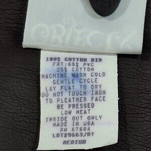 Materials: Front is 65% PVC / 35% cotton “pleather” and the back is 100% cotton rib knit.