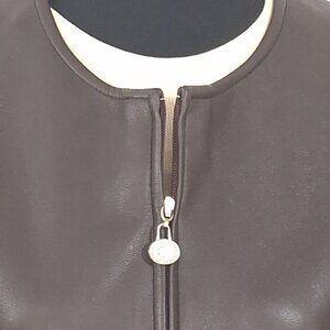 This Objects D’Art vest has a brown faux leather front, soft ribbed knit back, and that funky little zipper charm detail. It is SO cute in person and so soft and pliable. It's not too stiff like some pleather can be.