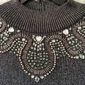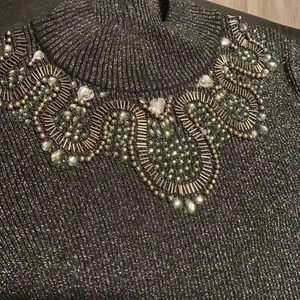 Seems like a smaller 2X please check my measurements. Cotton metallic rhinestone and beaded sweater. High neck line mock turtle neck - heavy knit with metallic threads. Pull over zipper back neck. Laying flat pit to pit 20” - shoulder to hem 26” - sleeve 24” . Preowned used condition please check all pictures.