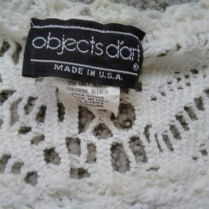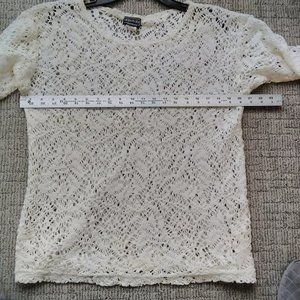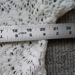 Beautiful long sleeve crew neck sweater. Cotton/poly. Size medium. Delicate looking but is a heavy crochet type sweater. I was going to list it as excellent condition but as I was photographing, I saw a very small spot, see last pix. I would think it will wash out but need to mention. Approx. measurement laying flat, 20.5 inches pit to pit. js222