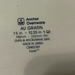 Oblong Anchor Hocking "AuGratin" Made Japan Oven 1 quart Casserole Baking Dish. Shipped with USPS Priority Mail. 12" long 2"tall 7 1/2"