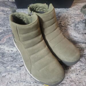 The Oboz Sphinx Pull-On Insulated B-Dry Women's Winter Boots in Pinedale are designed to keep feet warm and dry during the colder seasons. These slip-on boots feature a waterproof and water-resistant construction, along with insulation to protect against the cold. The leather and synthetic materials used in the upper and midsole provide durability, while the Vibram Arctic Grip outsole ensures traction on icy surfaces. Ideal for winter weather, these boots are both stylish and functional for any outdoor adventure. Only worn once. Excellent condition.