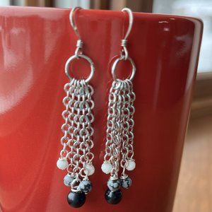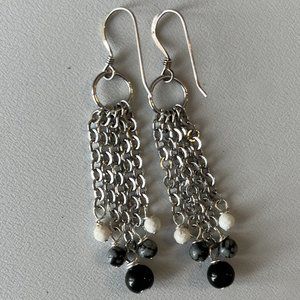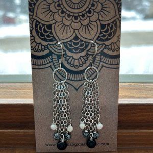 Obsidian and Howlite with Silver Chain Genuine Gemstone Earrings, Handmade