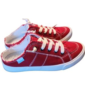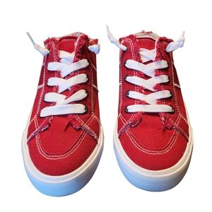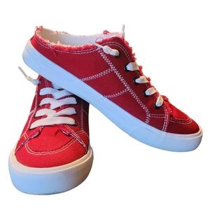 The Obtaom Women's Sneakers in red and white are a stylish and comfortable choice for casual occasions. These slip-on sneakers are US size 9 and feature a solid pattern, standard shoe width, and fabric upper material. In excellent condition, these shoes are perfect for the fall, summer, and spring seasons.