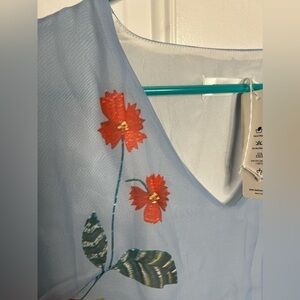 This beautiful OC Order Plus Blue Floral Maxi Tea Dress is available in size L. This enchanting dress is adorned with a plethora of red and green blooms, creating a breathtaking contrast against the sky-blue fabric. The dress is designed with eye-catching ruffled sleeves, adding a touch of drama to its overall appeal. It is brand new and has tags attached, promising a fresh and stunning addition to your wardrobe.