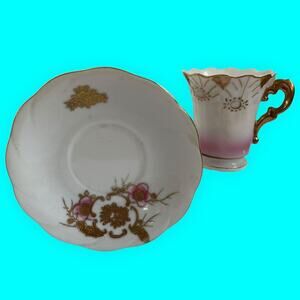 Pink and Gold Demitasse Cup & Saucer, Hand Painted. The cup is marked "Made in Occupied Japan." The saucer is marked "Made in Japan."