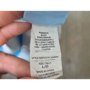 Pre-owned Ocean Avenue Swimwear two-piece set in Size L, including a blue geometric tankini top with adjustable straps and matching bikini bottom. The fabric has good stretch, full lining, and comfortable coverage. Both pieces are in very good used condition with no notable flaws. Please review all photos, as they are part of the description and you will receive exactly what is shown.