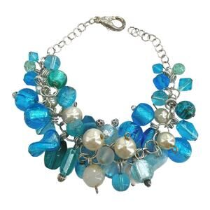 Ocean Blue Glass Silver Tone Dangle Bracelet 8 inch Adjustable Length