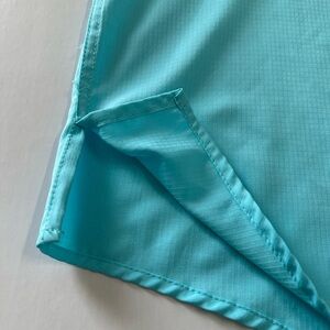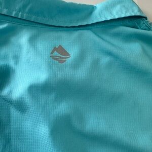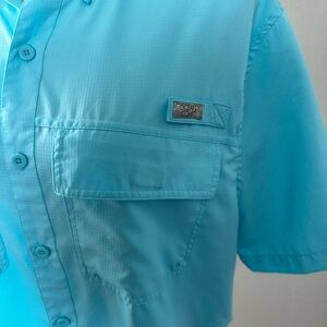 Men’s size medium ocean coast button up front fishing shirt, short sleeves with front pockets has vented back, aqua blue color #1818