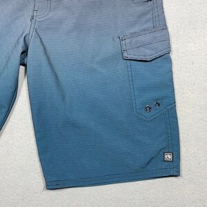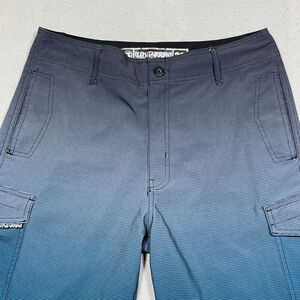 Pre-owned. No visible flaws. Lightweight stretch fabric with a quick-dry finish. Features include cargo pockets, back flap pockets, and a secure button closure. Gradient blue-to-black color with subtle stripe texture. Tag size 29. Flat lay waist measures approximately 15 inches (30" waist).