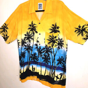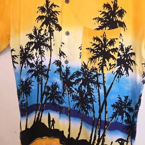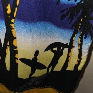 Previously Owned Hawaiian surfer Tropical shirt by Ocean Current Vintage. Short Sleeves, buttons down. Surfers and palm trees on print design.
