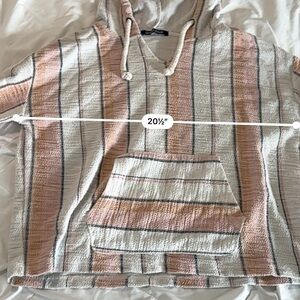 Stay cozy and stylish with this Ocean Drive Baja Striped Beach Pullover Hoodie. Designed in an oversized fit, this hoodie is perfect for beach days or casual outings. Though the size tag is missing, it fits like a Size S, as confirmed by its previous owner. Refer to the approximate measurements shown in the pictures for accuracy. Despite the missing tag, it’s in good condition and ready to add a laid-back vibe to your wardrobe. Peach, white and blue stripes in color.