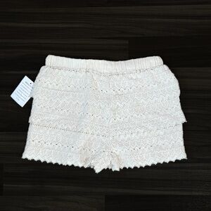 Light cream Ocean Drive shorts scalloped with three layers of crochet ruffle. Elastic waist band with drawstring tie. These shorts have a very boho / country look. Relaxed and comfortable but just dressy enough for heels or pumps. 100% cotton.