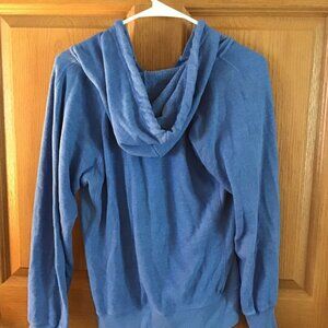 Ocean Drive Medium Blue Hooded Sweatshirt with drawstring hood, White Anchor, Ocean City New Jersey on front, hand pockets, logo is somewhat faded,