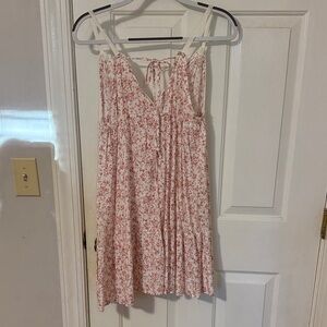 Charming mini dress with pink floral pattern. Features delicate straps and a flowy silhouette. Perfect for casual outings.