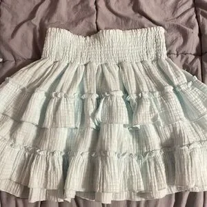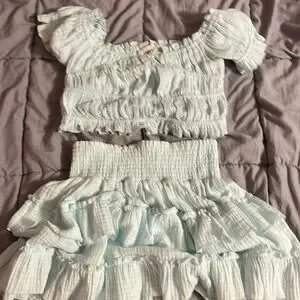 This set is so adorable! You can wear the top off or on the shoulder. Perfect for the beach/vacation! No signs of wear! The color is a pastel teal!