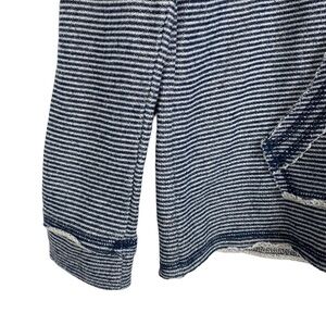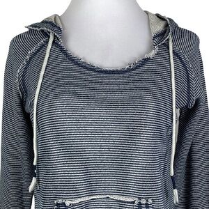 Ocean Drive Women's Small Navy Blue White Striped Hooded Drawstring Long Sleeve Kangaroo Pocket Sweatshirt. Hoodie has raw edges. Great Condition. No rips, flaws, or stains. Smoke free home.