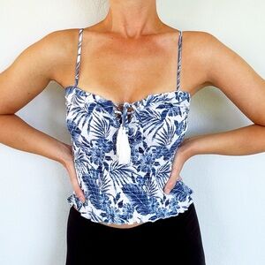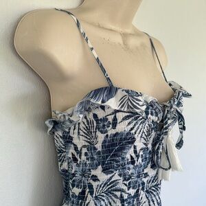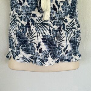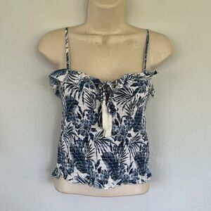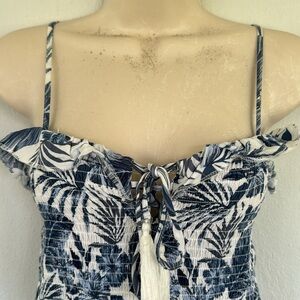 Ocean Drive blue and white tropical print stretchy smocked elastic fit lace up tassel trim ruffle neckline adjustable spaghetti strap tank top. The size tag is missing, but it would best fit a small or XS woman. Please ask for measurements if you’re not sure..