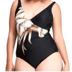 Feathered wing design over bust. black one piece swimsuit. Lightly padded cups.