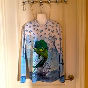 Ocean life fishing top fun for the boat size small has a big green mahi-mahi on front 50 UPS sun protection. It’s got water dots on it light blue dark blue. It’s got a hood in the back. Keep you warm on those chilly mornings machine wash quick dry material stretchy. 🌴