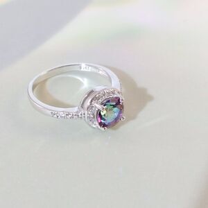 The ocean blues of the mystic gemstone exhibits a rainbow color effect that changes as the ring is tilted with blue colors predominate.