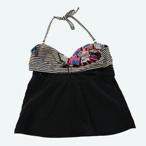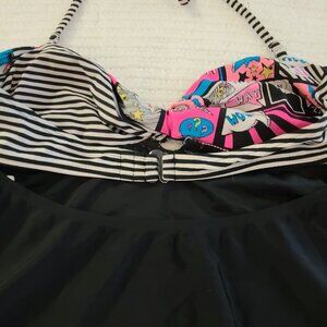 Ocean Pacific Colorful Comic-Print & Striped Halter Bikini Top With Black Skirt
