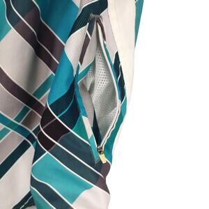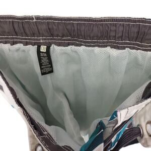 -Features: Tie waist with hook/loop fastener fly, lower leg zippered pocket, embroidered OP logo, inner mesh lining, geometric design in teal, green, gray, black and white