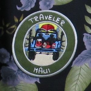Pre-Owned Condition! 100% Cotton. Handsome Hawaiian Button Down Shirt with an Iron-On "Maui Traveler" Patch and Wood-Like Buttons(spares attached).