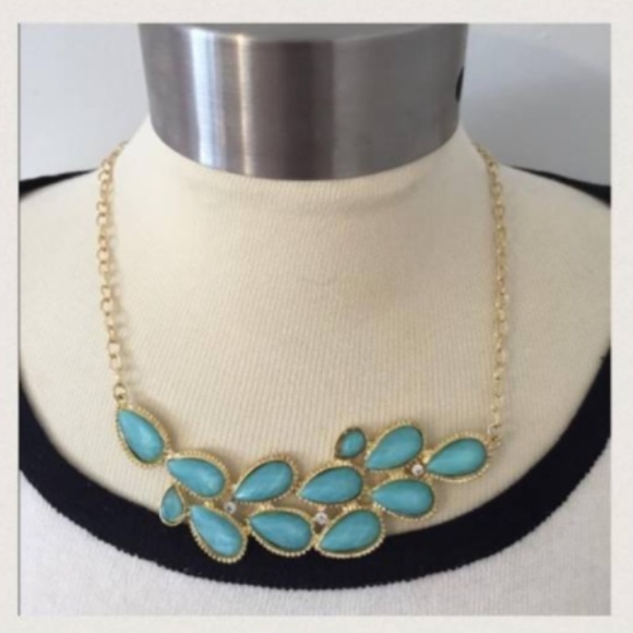 Clustered turquoise colored stone necklace, featuring a rhinestone detail and gold chain.