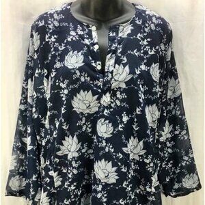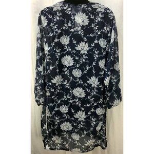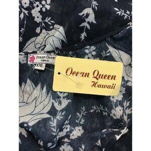 A women's size extra extra large cover-up from Ocean Queen. The cover-up is in blue and white with a floral pattern. The cover-up has scoop neckline, button front, 3/4 length sleeves, above knee, pool, beach and is new with tags. Cover up is on smaller side would fit a size large better. Please see measurement below.
