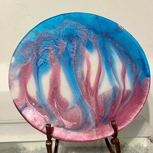 Elevate your table with this stunning handmade resin set featuring a large serving board and two matching decorative plates. Crafted with a dreamy swirl of ocean blue, soft pink, and pearl white tones, each piece is unique with a glossy, glass-like finish. Perfect as a functional art piece for entertaining, gifting, or home décor. Made from high-quality, food-safe epoxy resin. Ideal for housewarmings, Mother’s Day, or Eid gifts. Decorative use only recommended for plates.