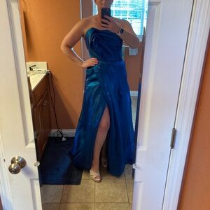 Beautiful color Terani Couture dress with a high slit. It was tacked near the top to not show so much but can be let back out. Slightly hemmed on front bottom but still long enough for 5’8” and wearing 5 inch heels. Worn once. Smoke free home. Kept in dress bag.