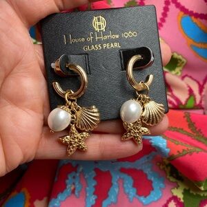 These House of London 1968 earrings are a stylish and unique accessory. Featuring gold hoop design, dangling round pearls, and delicate starfish & seashell charms, they add a luxurious and romantic touch to any look.