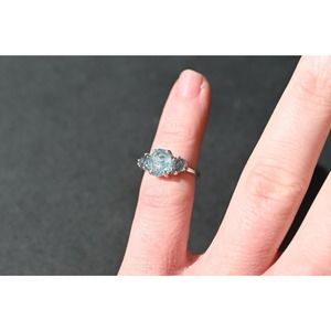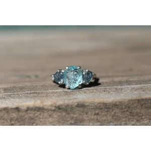Custom handmade engagement ring, delicate band with three raw gemstones; aquamarine and Montana Sapphire in sterling silver, 10k or 14k yellow and white gold.