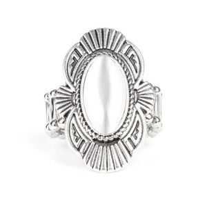 A white oval cat's eye stone is pressed into the center of a scalloped silver frame radiating with linear detail for a whimsical flair. Features a stretchy band for a flexible fit.