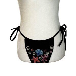 These bikini bottoms are tie on and have a cheeky fit at the back. This piece is hand embroidered with an eco-friendly Italian metallic fabric.