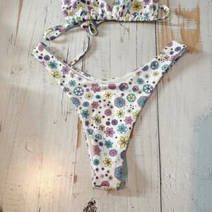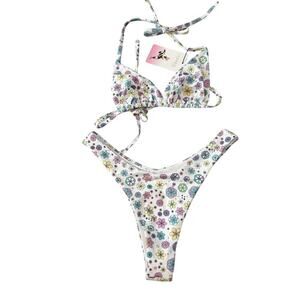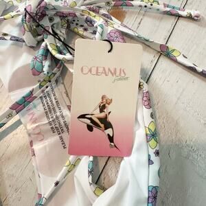 Oceanus Swimwear Revolve Ditzy Floral Bikini Set White Multi Size Large. New with tag, no flaws. The set includes a triangle swim top with spaghetti straps and mile high cut cheeky bottom that provides a flattering silhouette for any body type. Made from a combination of Lycra and Polyamide.