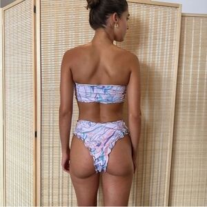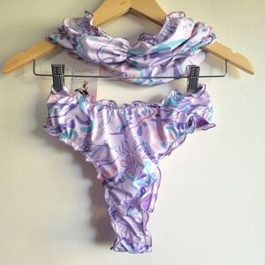 Oceanus, Teresa Bandeau Ruffle Abstract Bikini Set, Purple/Seafoam/Lilac, Size S. Retails for over $300, SOLD OUT.